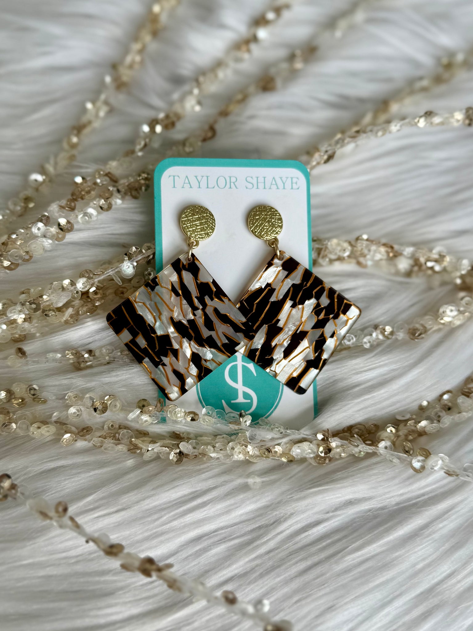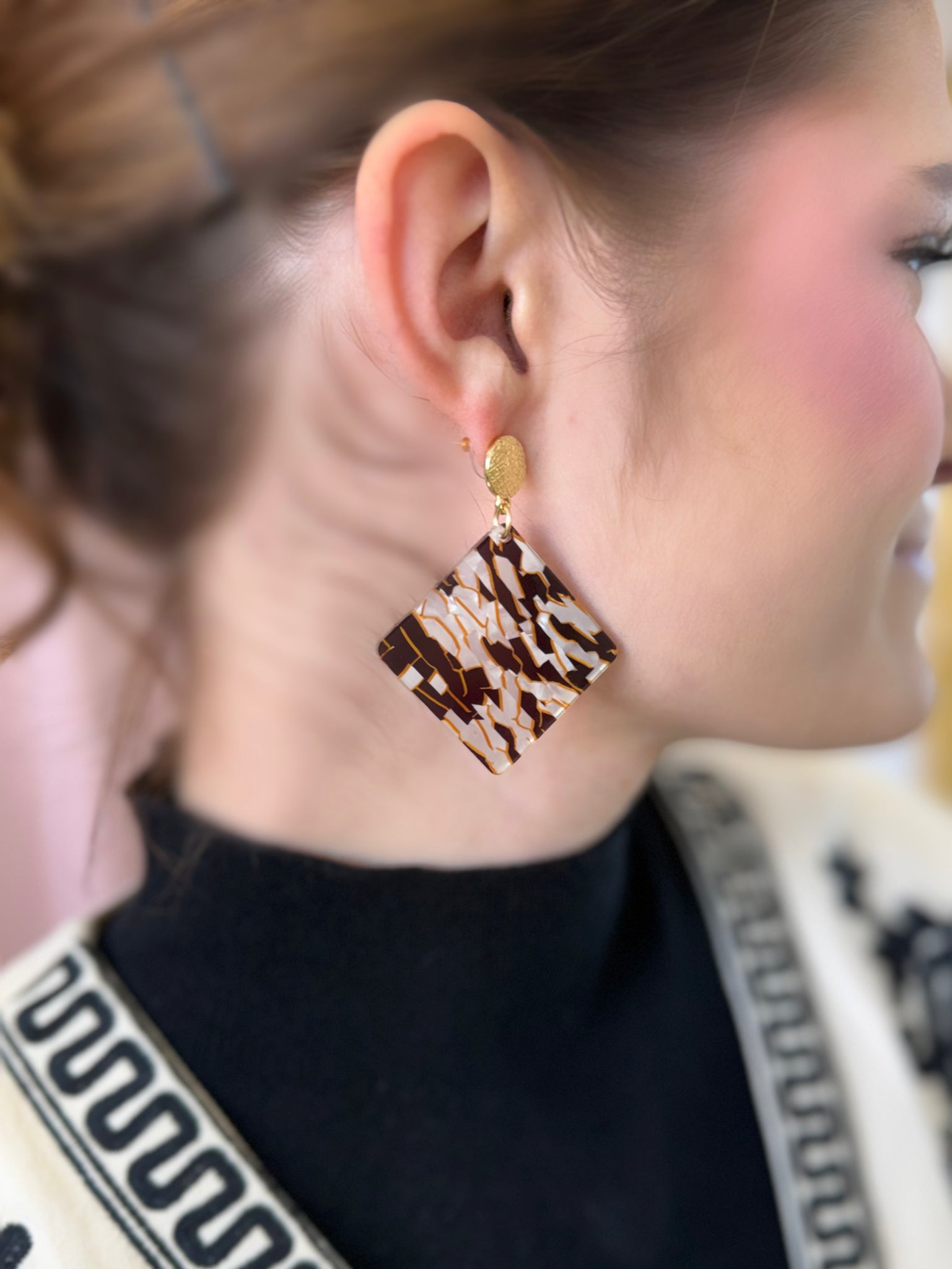 Acrylic black/silver/gold dangles with a round god stud at the top.