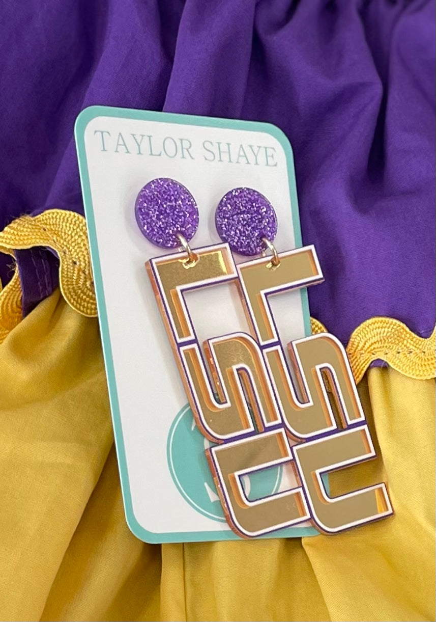 2-tier LSU gold mirror drops with purple glitter post