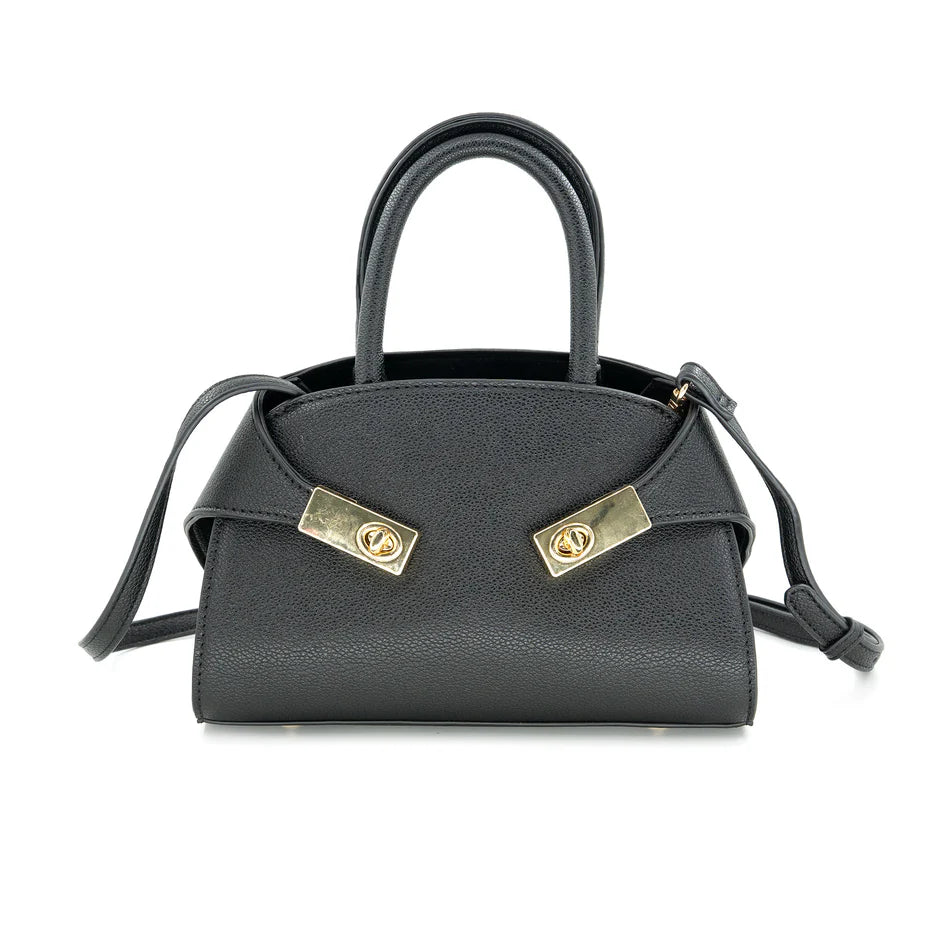 Small black purse with turn clasp on the front to widen or close the the opening. Includes cross body strap.