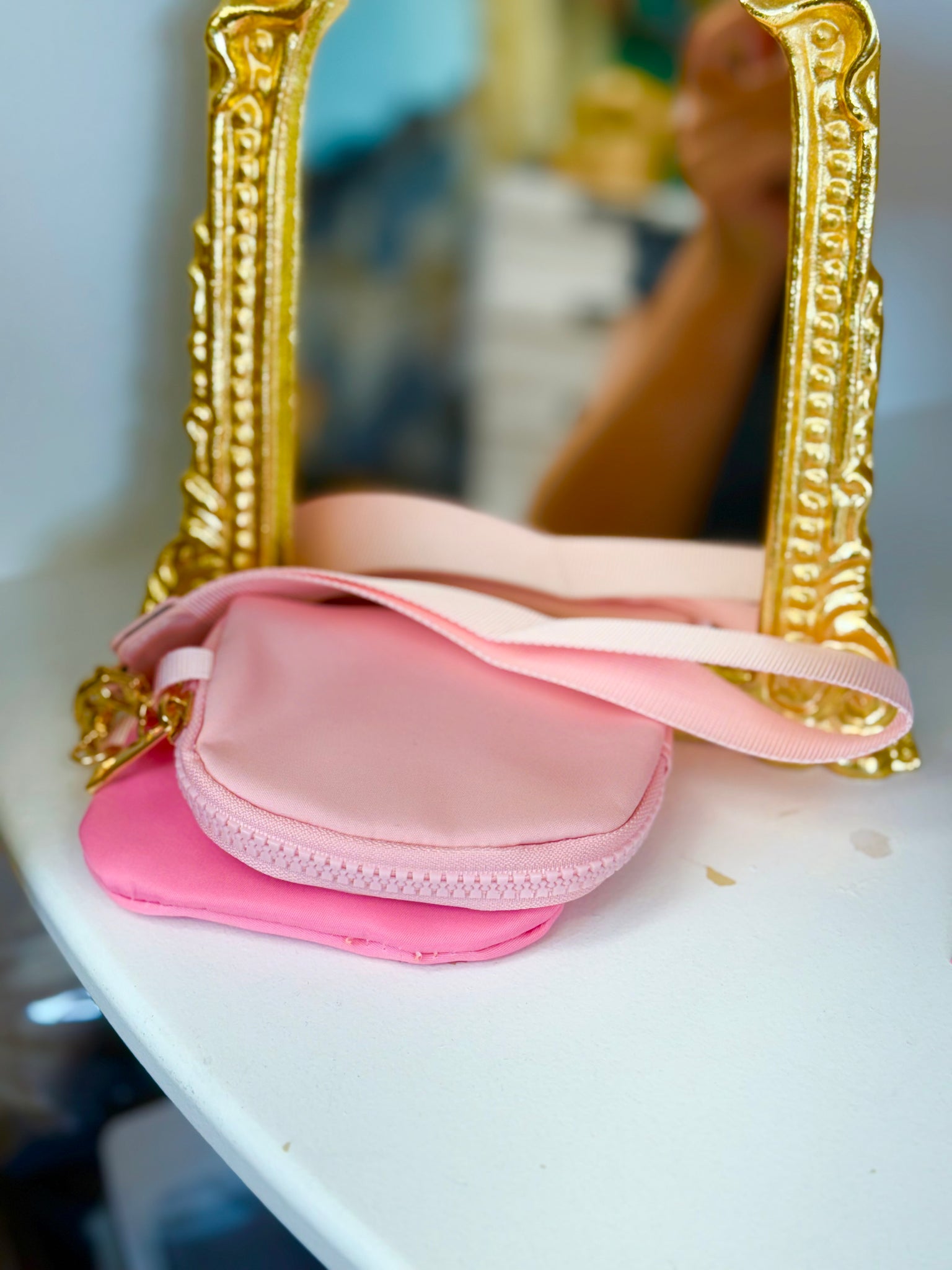 Wristlet keychain with double coin pouch bags. One bag measures 4.5" x 2.75" and the other 4" x 3.5"
