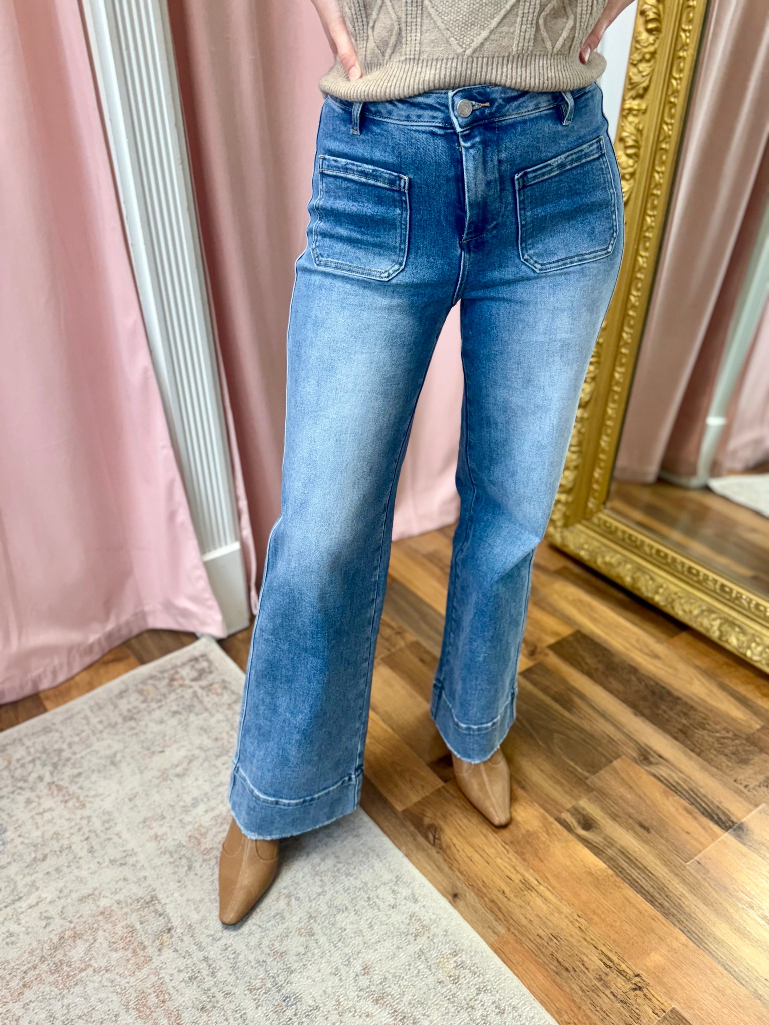 Elevate your everyday look with the wide-leg jeans, featuring unique front pockets and a vintage wash, these jeans offer comfort and effortless style.