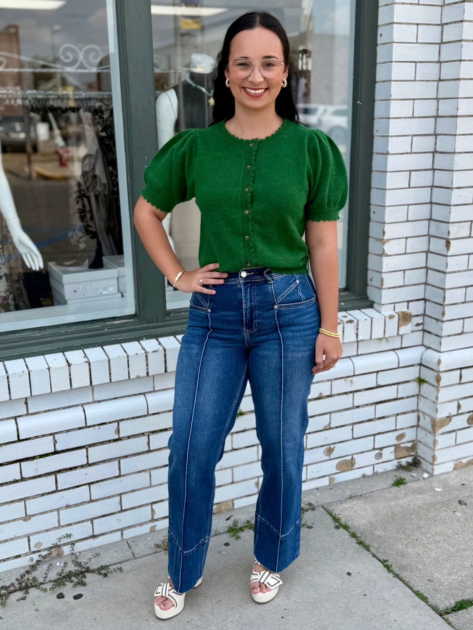 Holly straight leg jean in midtown wash, featuring a high rise design and a wide leg band for a sleek look.