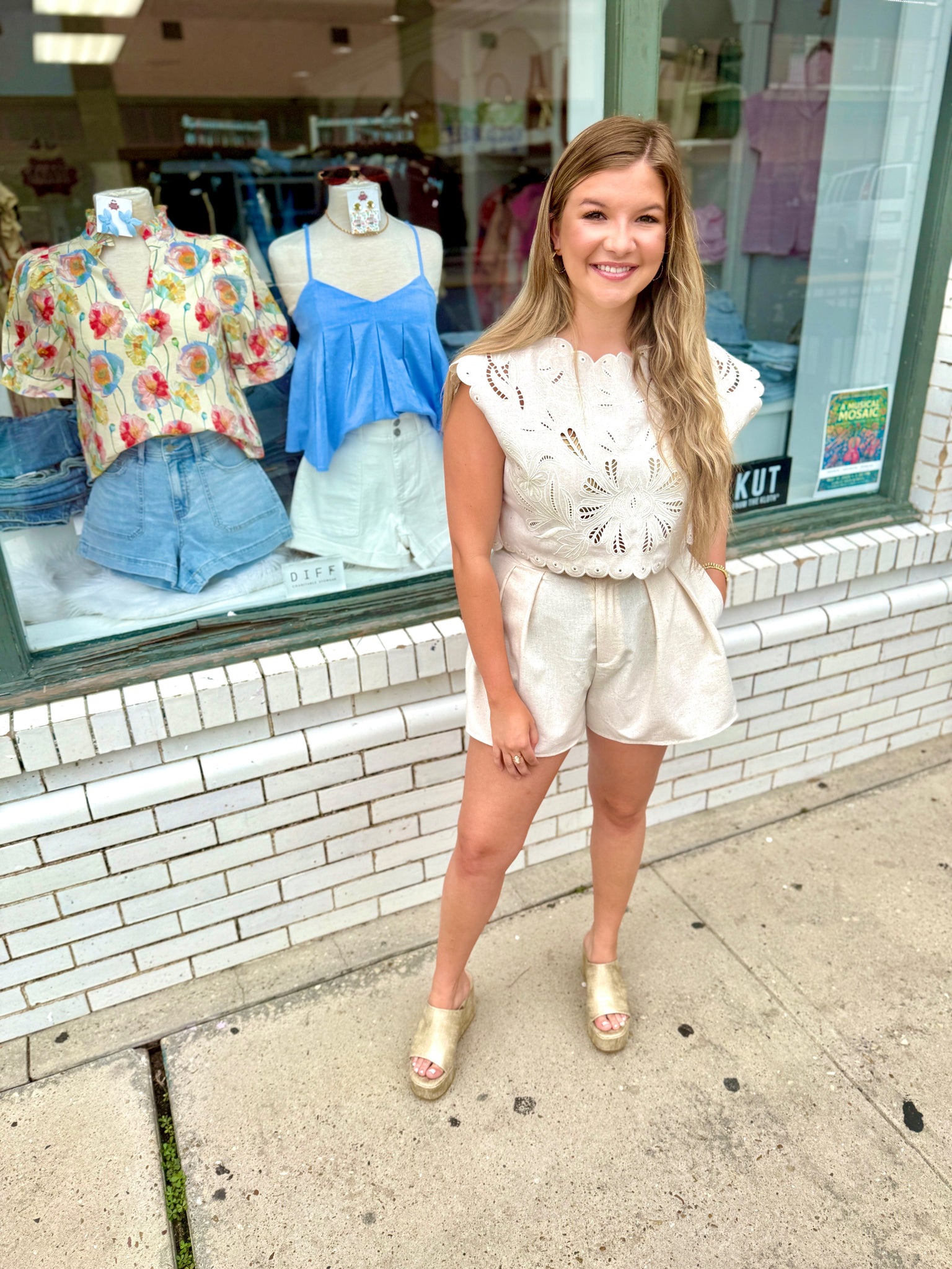 Linen mix tone to tone embroidery cut out design scallop detail crop top and matching shorts set.