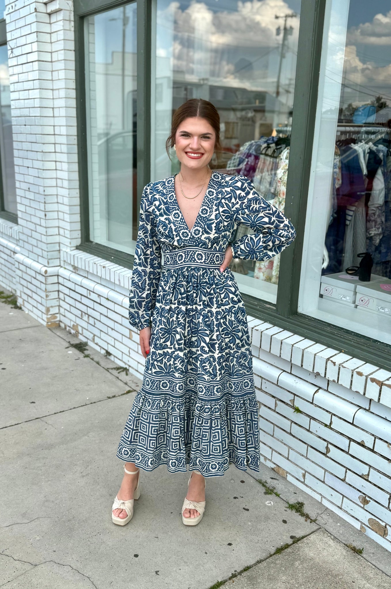 Tiered long sleeve midi dress. V-neck. Fitted waist with elastic back. Hidden side zipper.