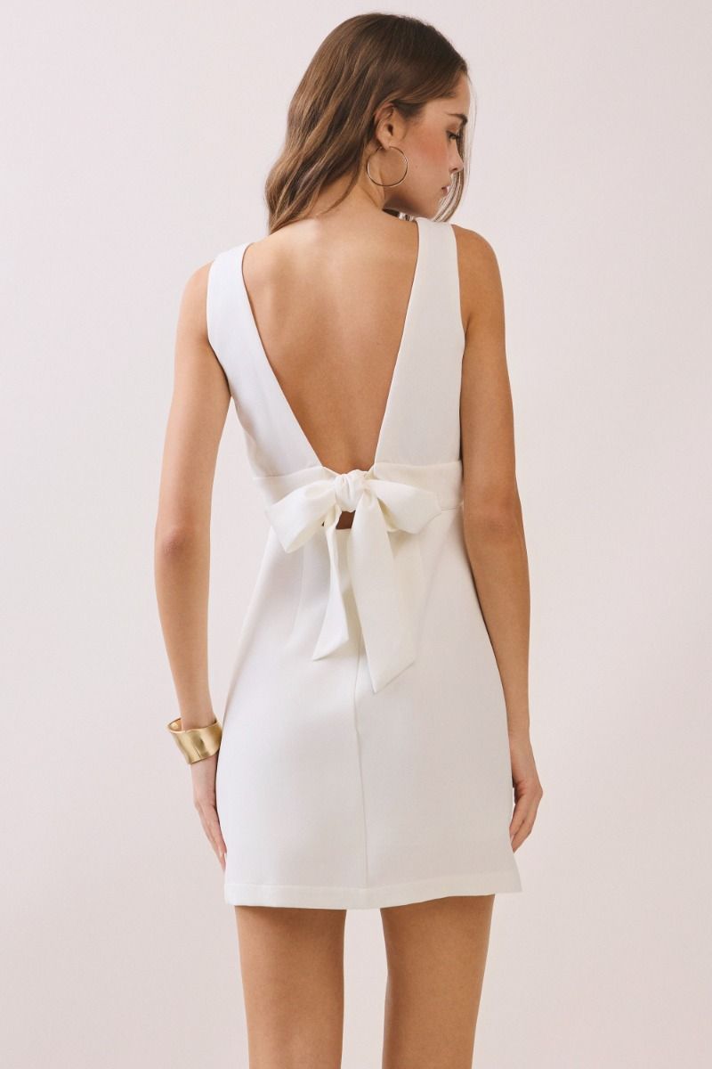 A sleeveless mini dress featuring a deep V-neckline and wide waistband that enhances the silhouette. Designed with a dramatic low back and finished with a self-tie bow for a feminine touch.