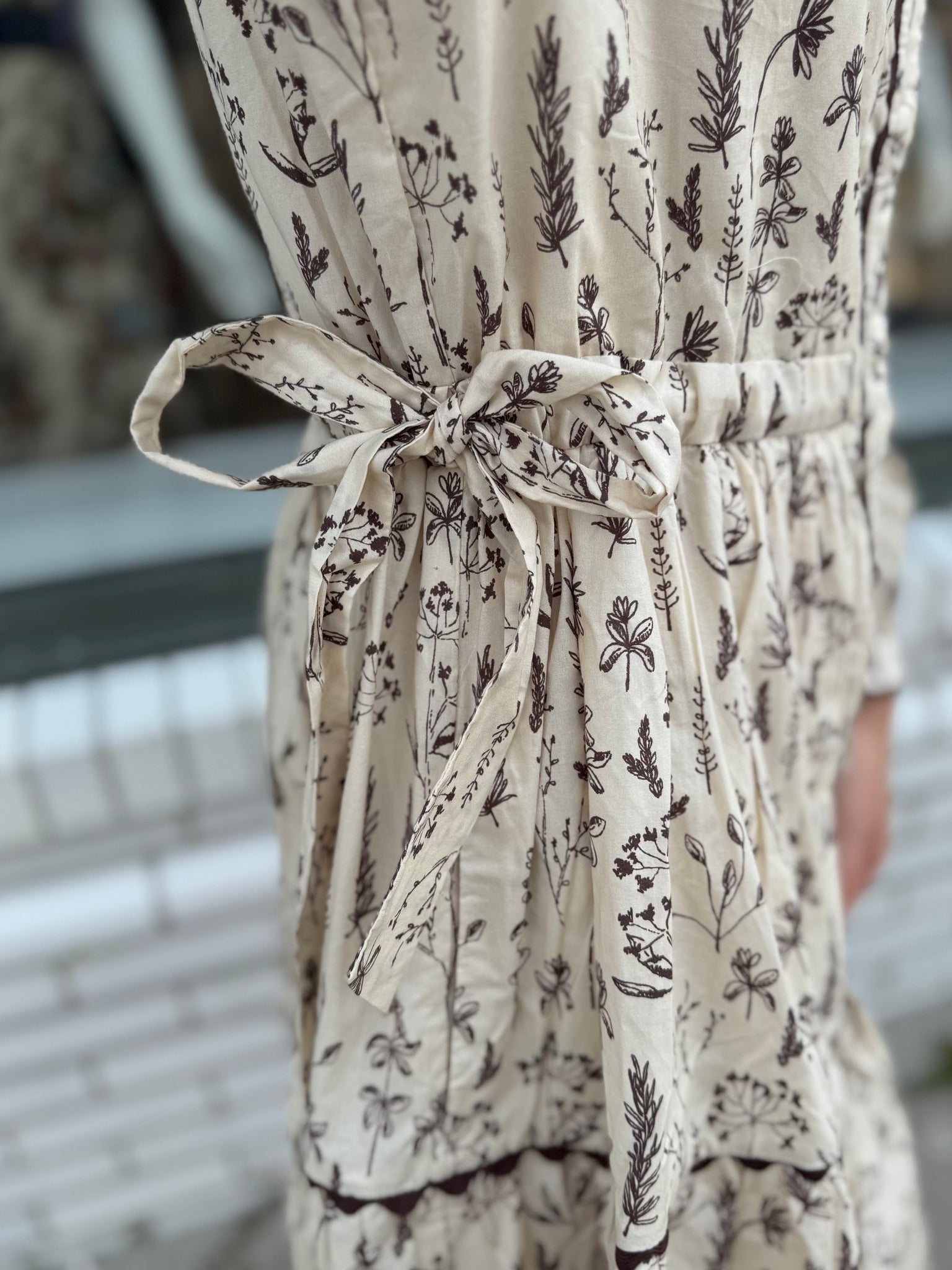 Long sleeves button down floral dress with side pockets, drawstring waist, side waist tie detail, lace trim accent.Also available in a dark charcoal color