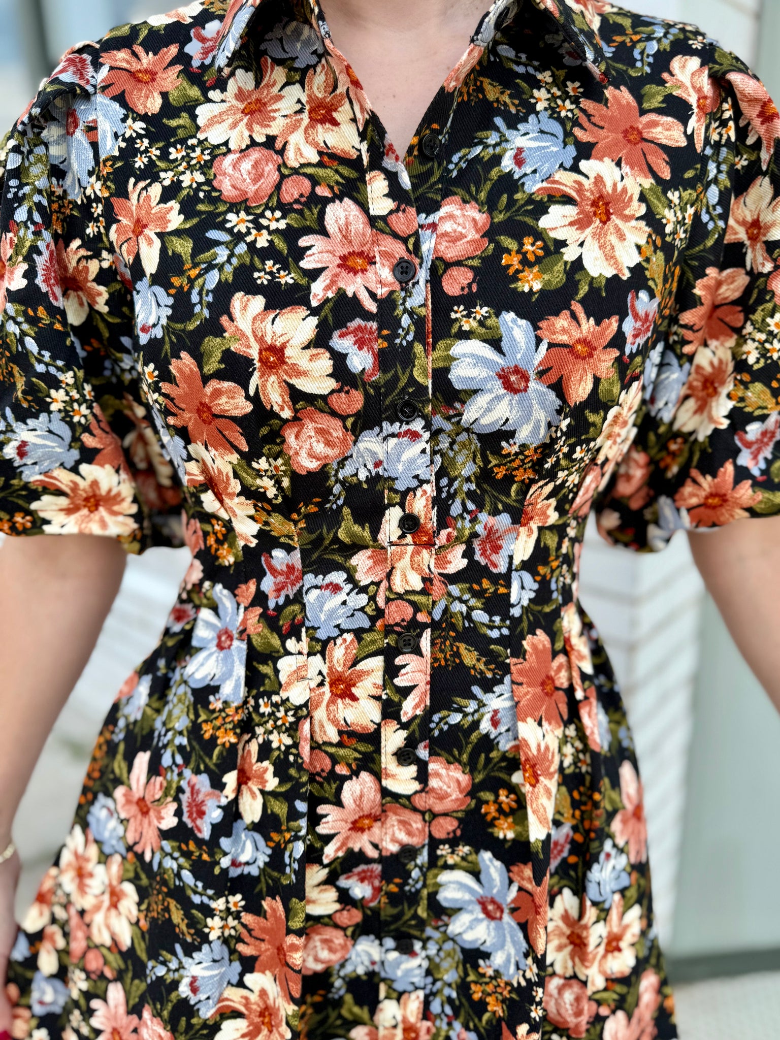 Multi-floral mini dress. Non functional buttons with a side hidden zipper.