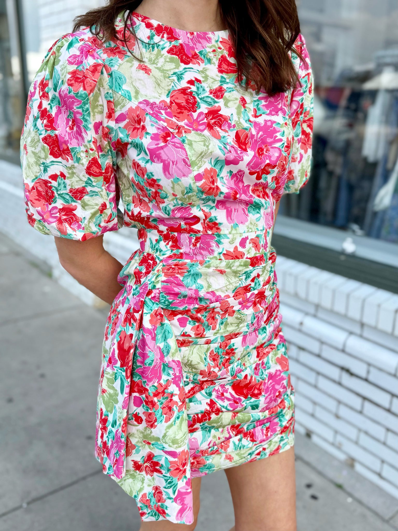 Ruched short puff sleeve mini dress in cotton voile fabric. This style features a mini skirt with shirring, short puff sleeves, and center back hidden zipper closure at back.