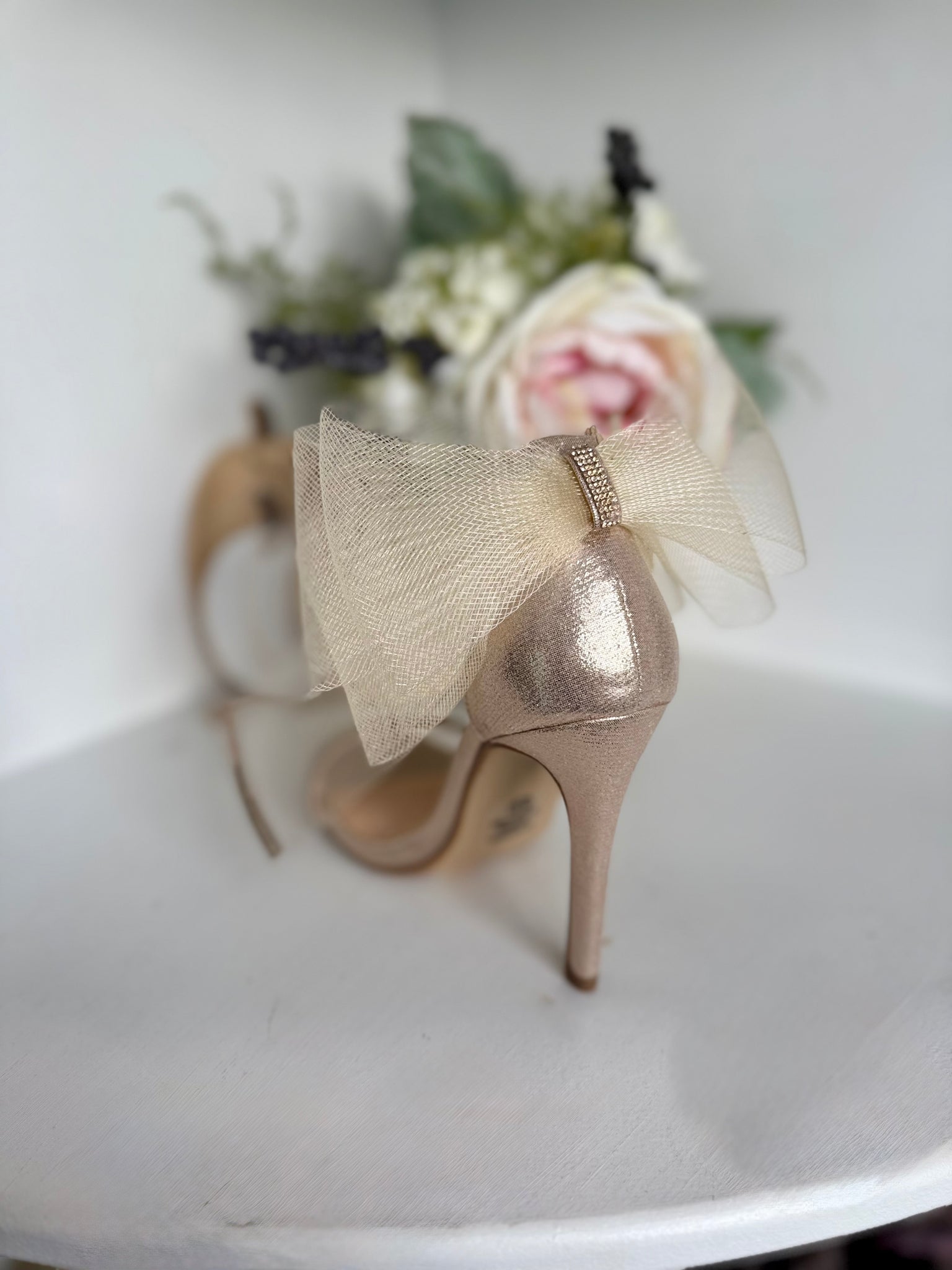 Gold heel with rhinestone strap. Ankle buckle with big, triple bow. Heel height=3.5"