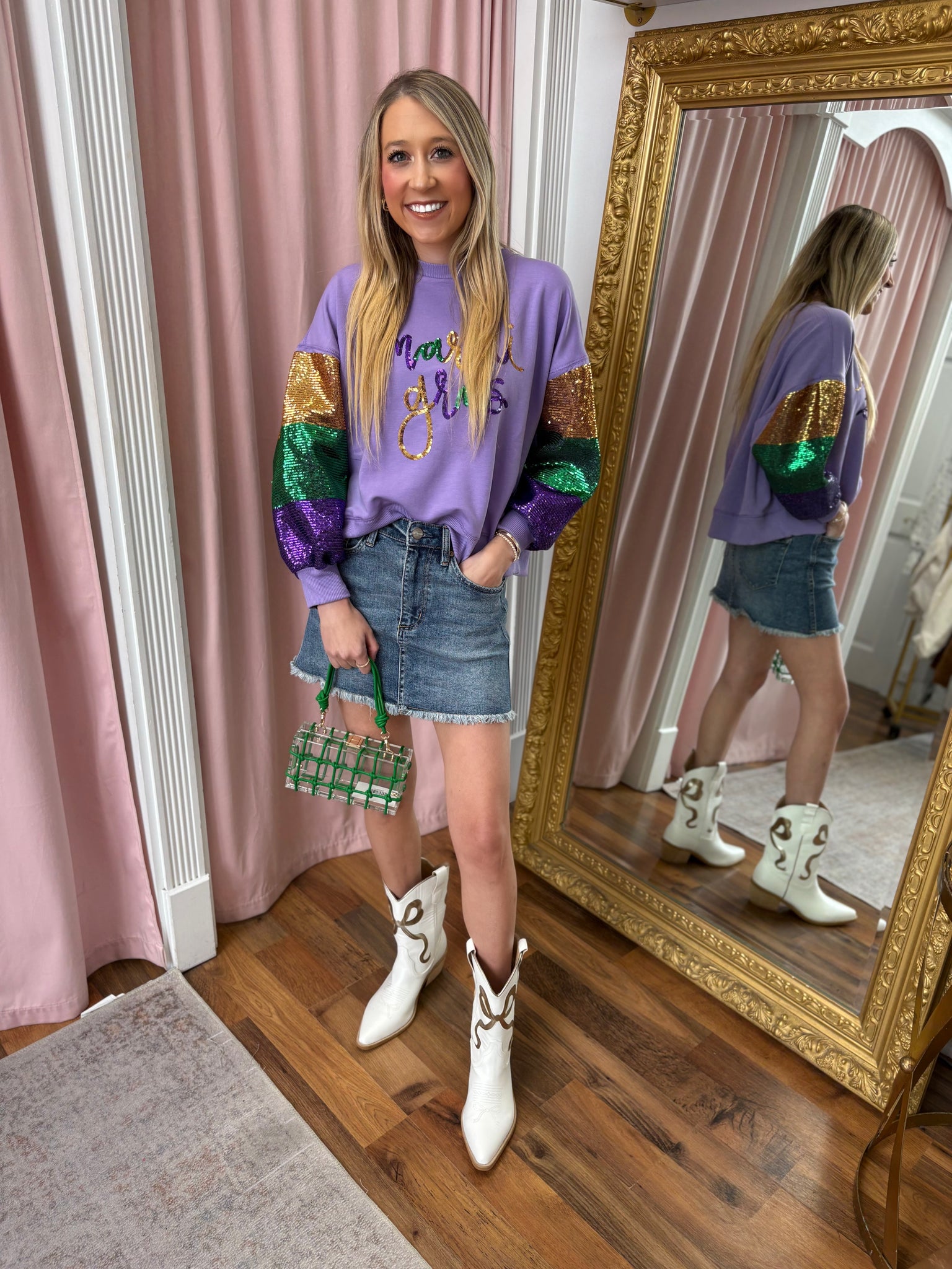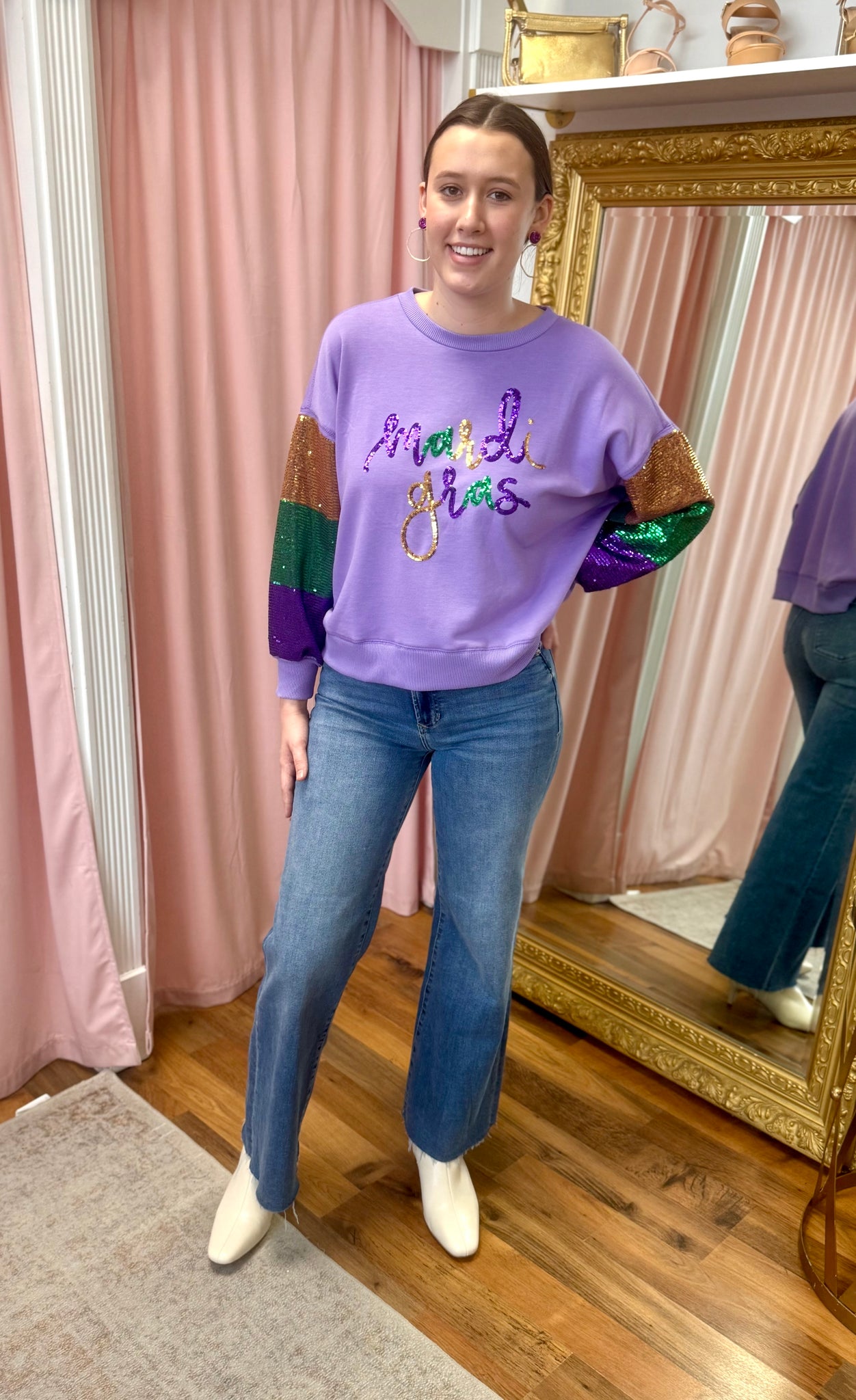 Long sleeve Mardi Gras sweater. Lightweight and easily layered. Sewn on sequin sleeves.