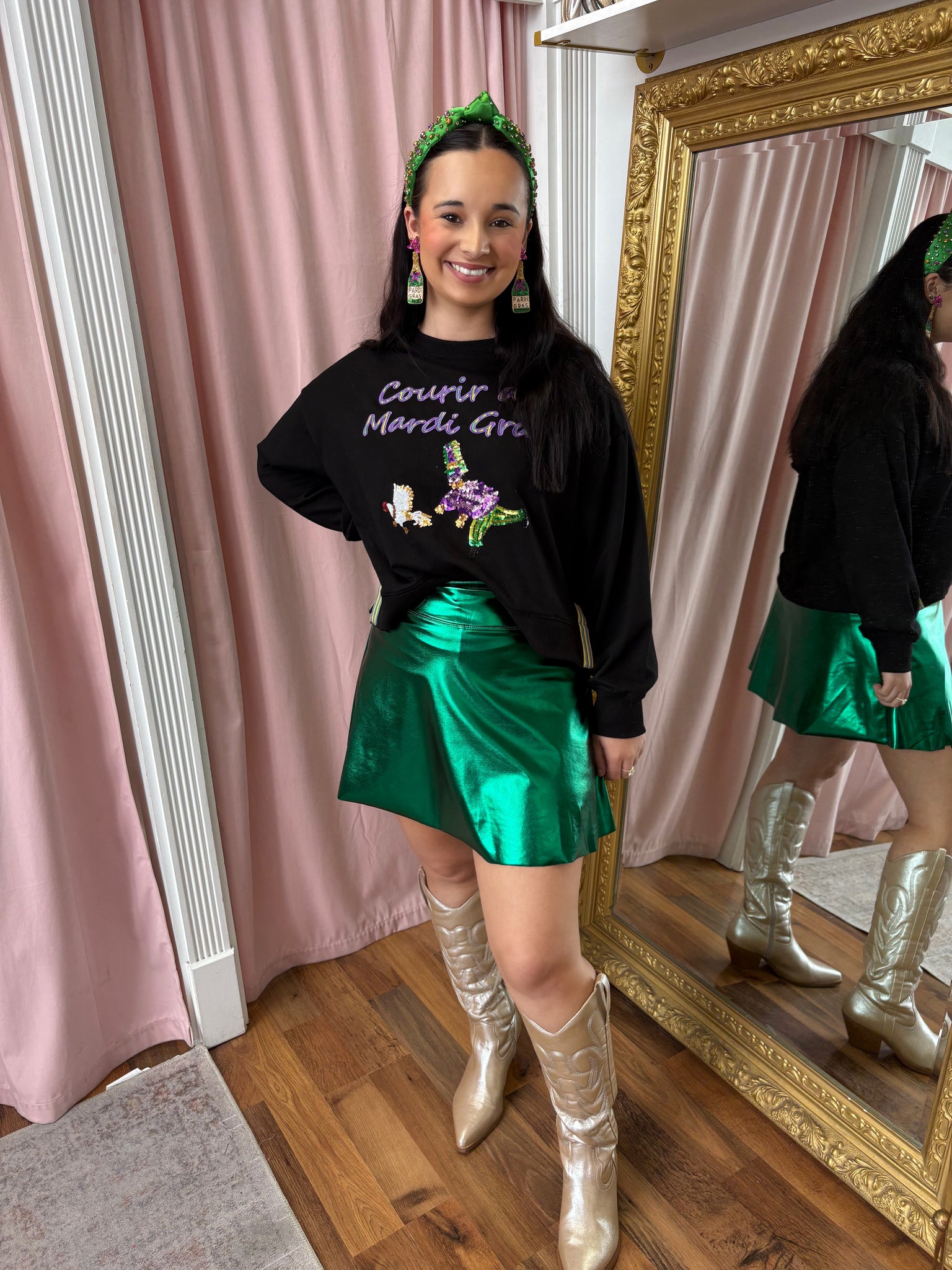 Long sleeve knit top. (Not a sweatshirt) Side slits with embroidered Mardi Gras colored trim. Embroidered “Courir de Mardi Gras” and a sequin man chasing a chicken. Runs true to size, order your true shirt size. Size up for length/sleeve length. Mal and Kennadi both wear the size Medium.