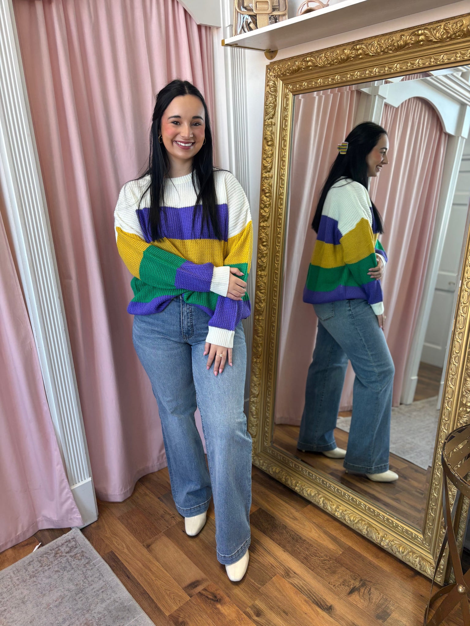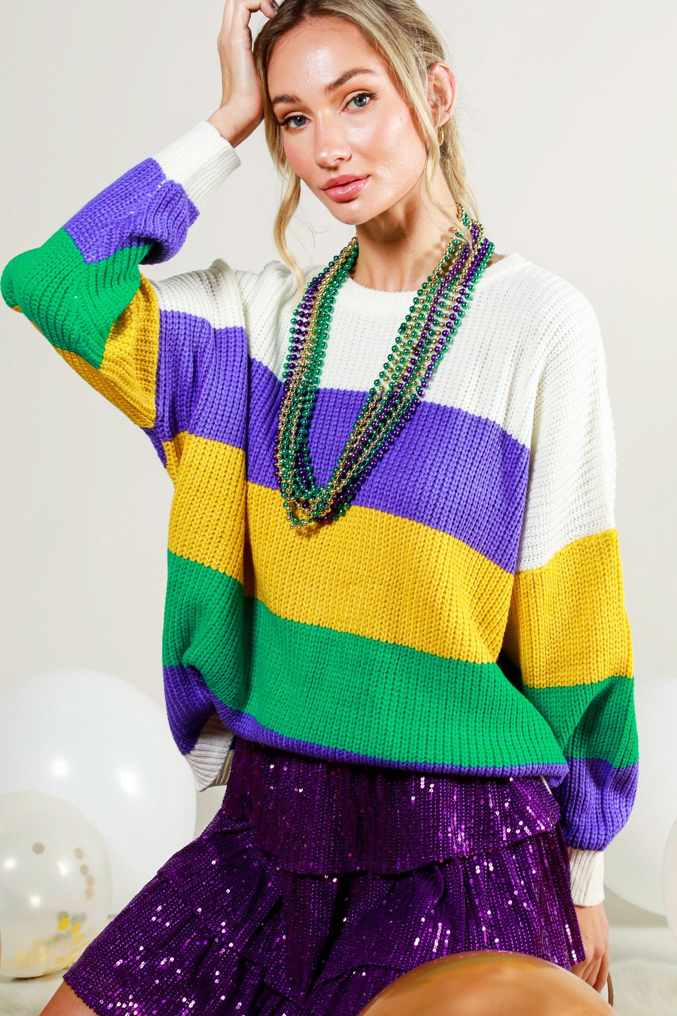 Crew neck Mardi Gras stripe long sleeve sweater