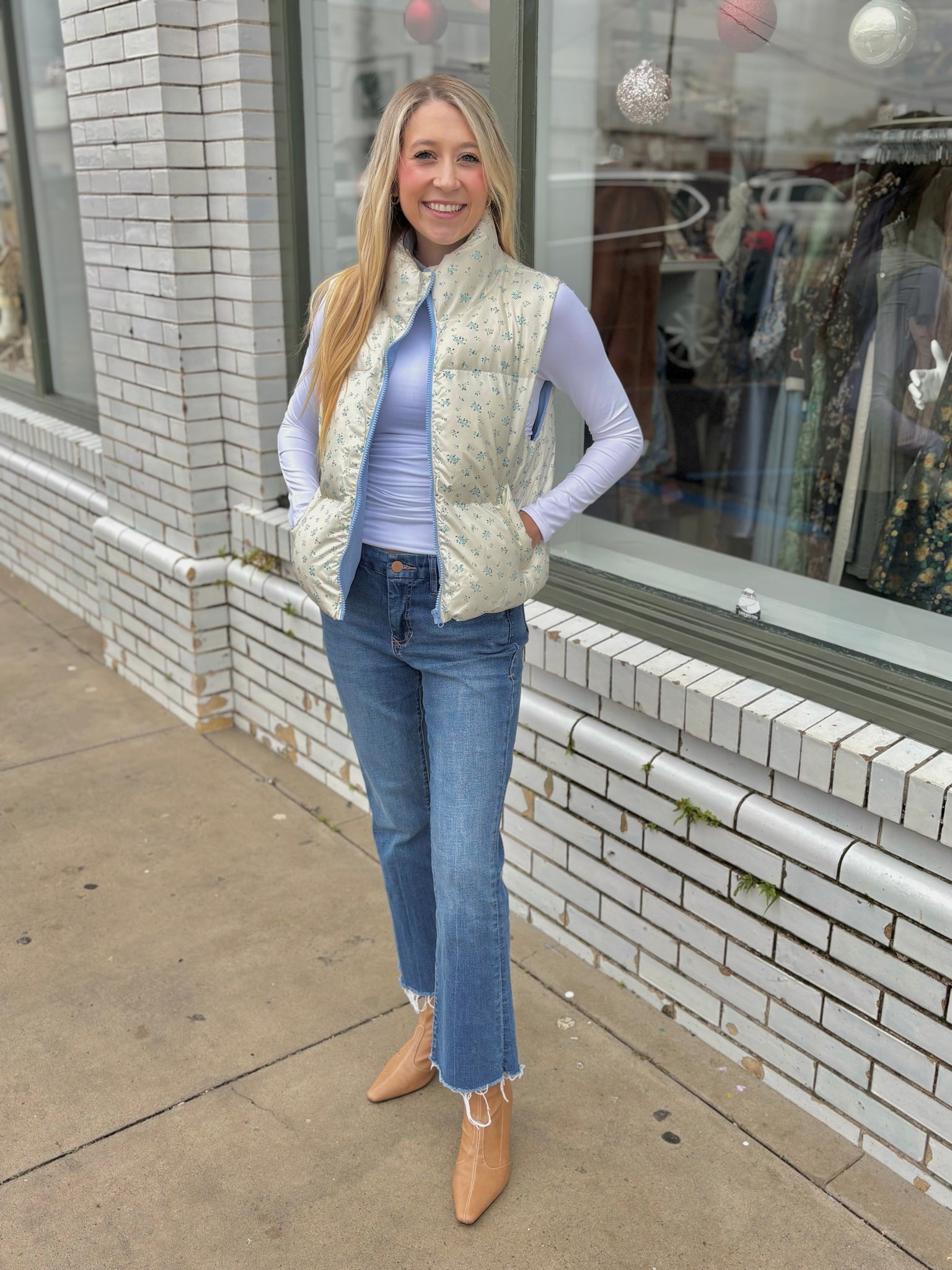 - Floral Printed Cropped Puffer Vest - Mock Neck - Front Zipper - Side Pockets - Adjustable Bottom Hem String