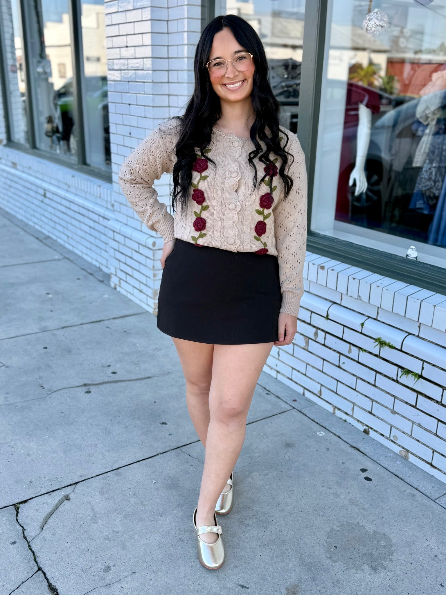- Buttons: Fully front-buttoned with matching knit-covered buttons