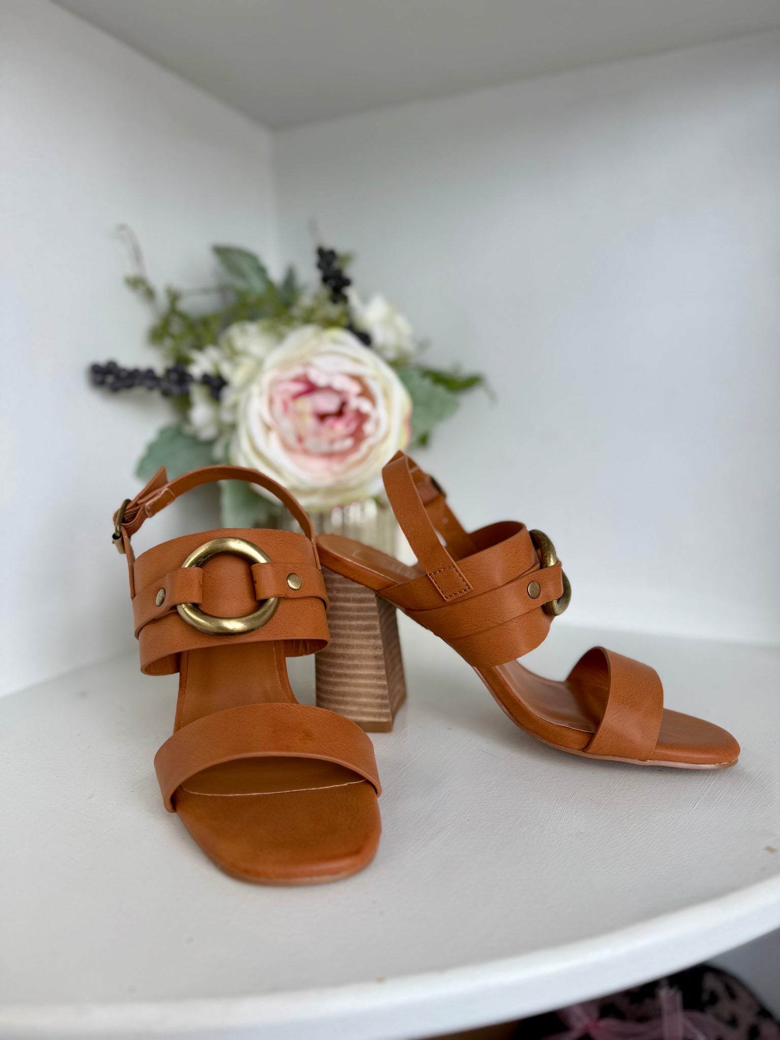 Double strap with ankle buckle. Adorned with a worn gold detail. Heel is about 3.5"