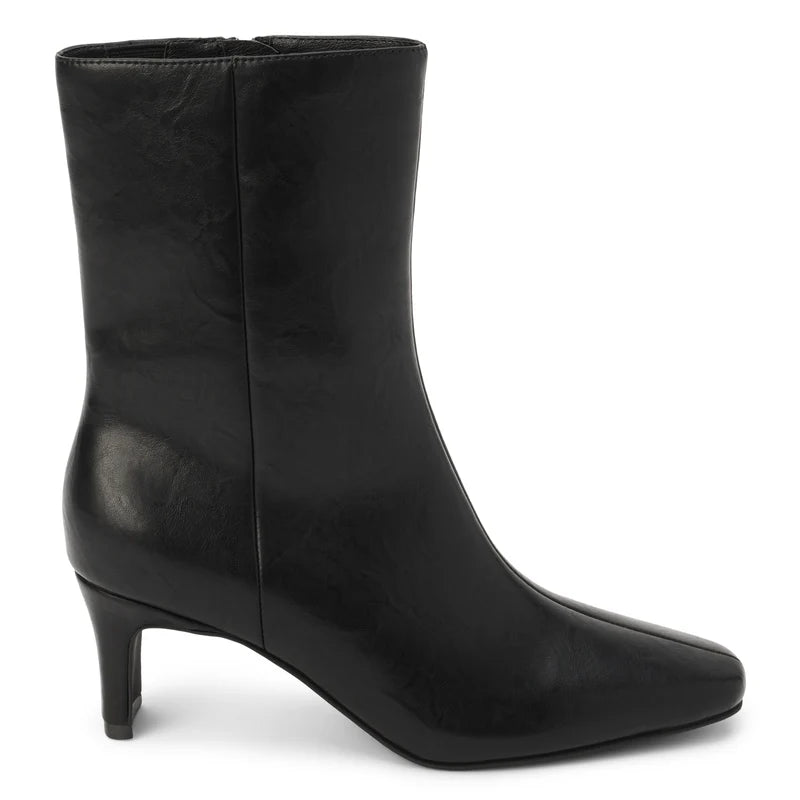 Ankle boot. Square toe. Zipper on the side for ease putting on and taking off. Minimalist silhouette.