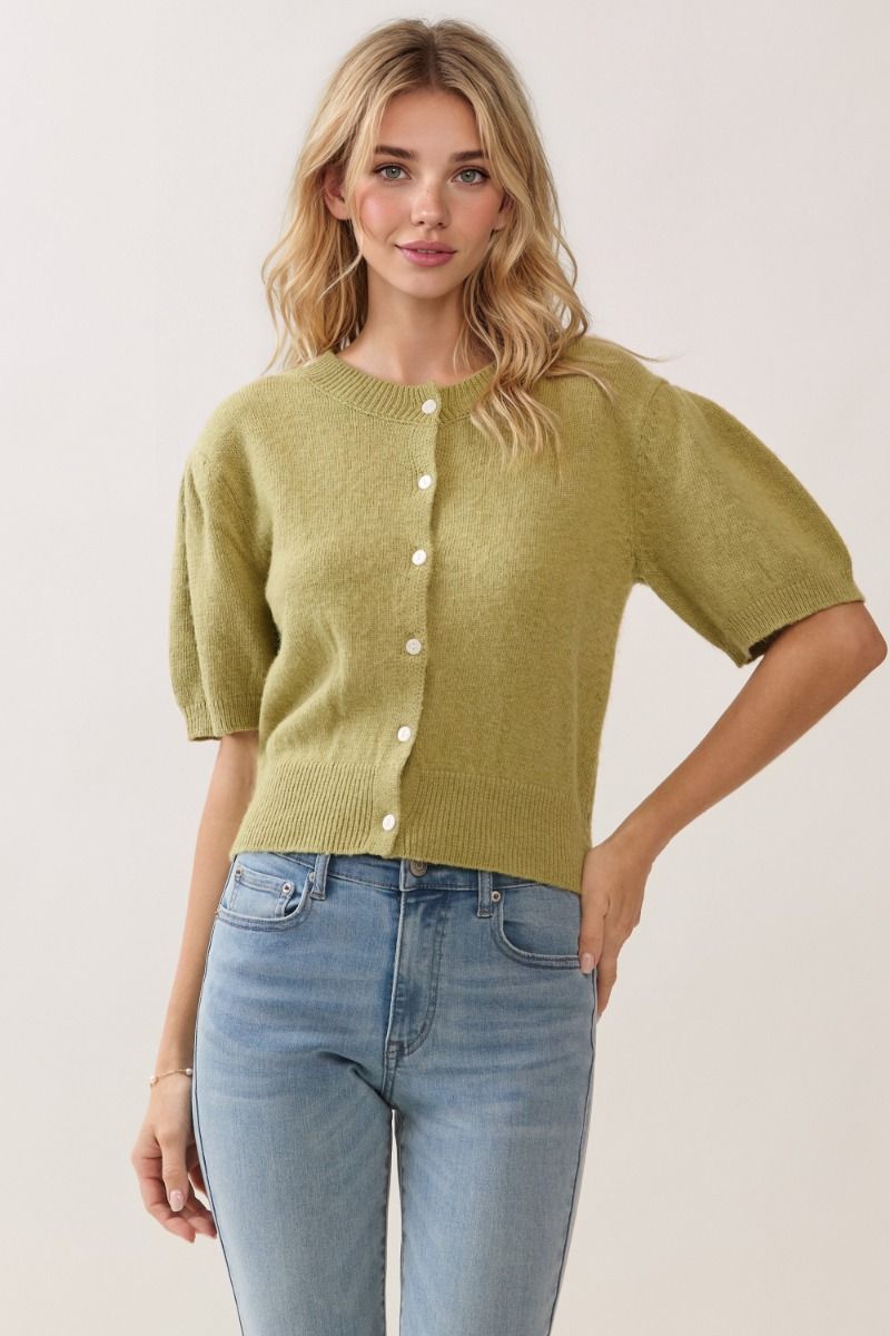 A soft knit top featuring a classic round neckline and a button down front. Designed with short puff sleeves, ribbed trim at the neckline and hem.