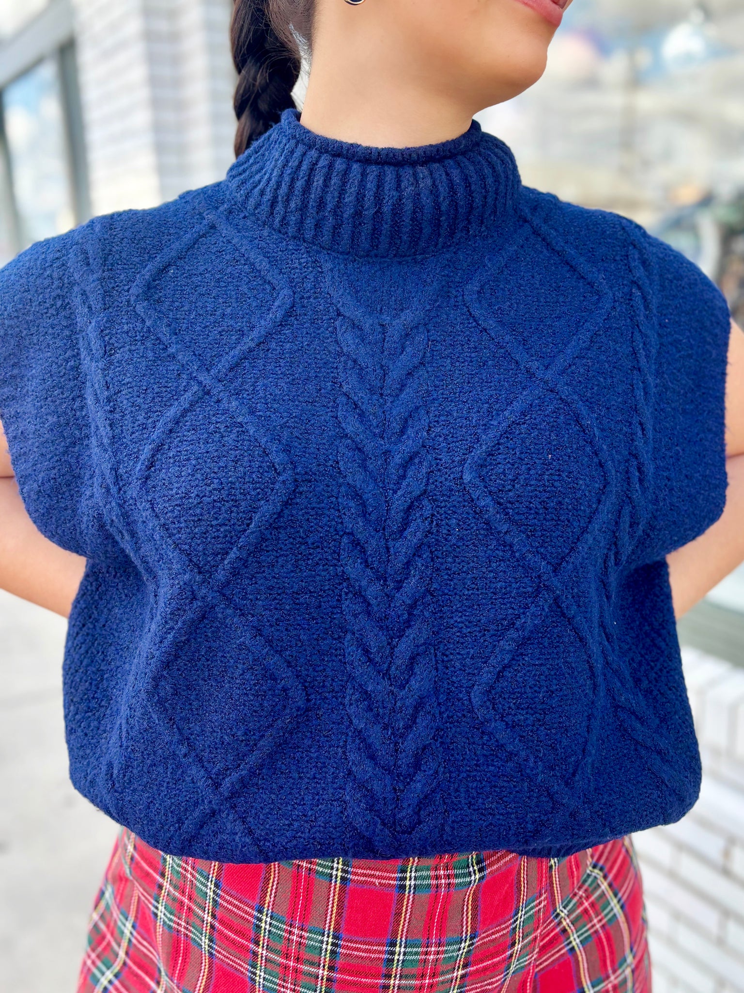 Solid cap sleeve mock neck sweater knit top featuring cable knit pattern. Unlined. Knit. Non-sheer. Medium weight.
