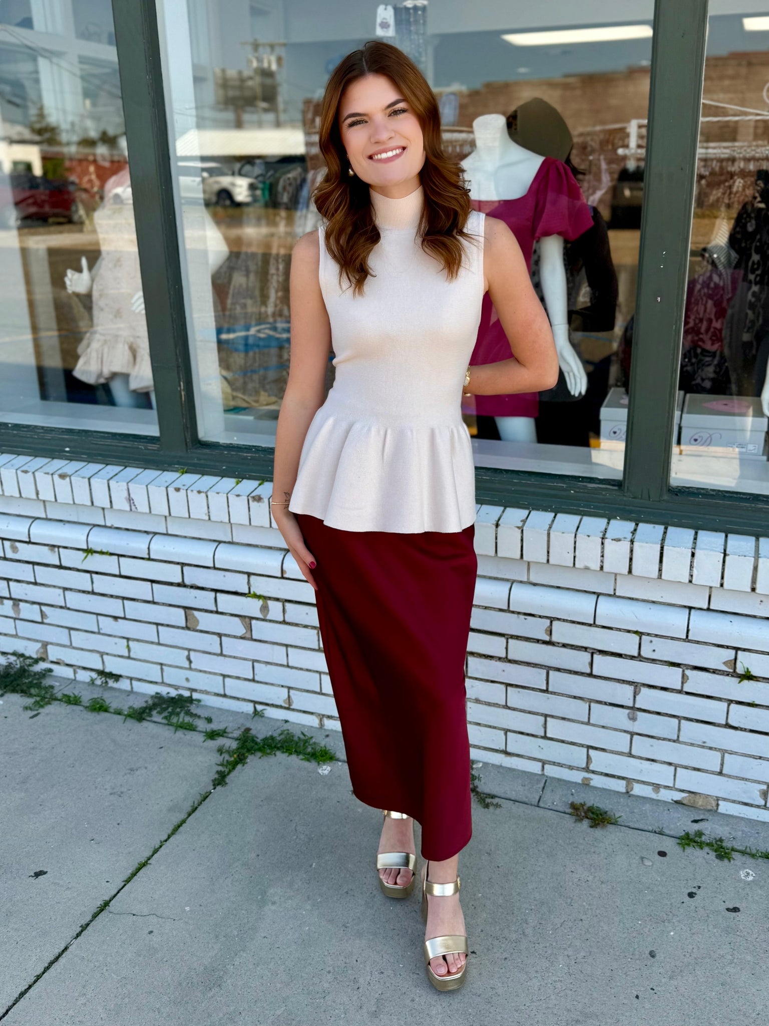 Mock neck peplum sweaterSleevelessWould be perfect dressed up or down.