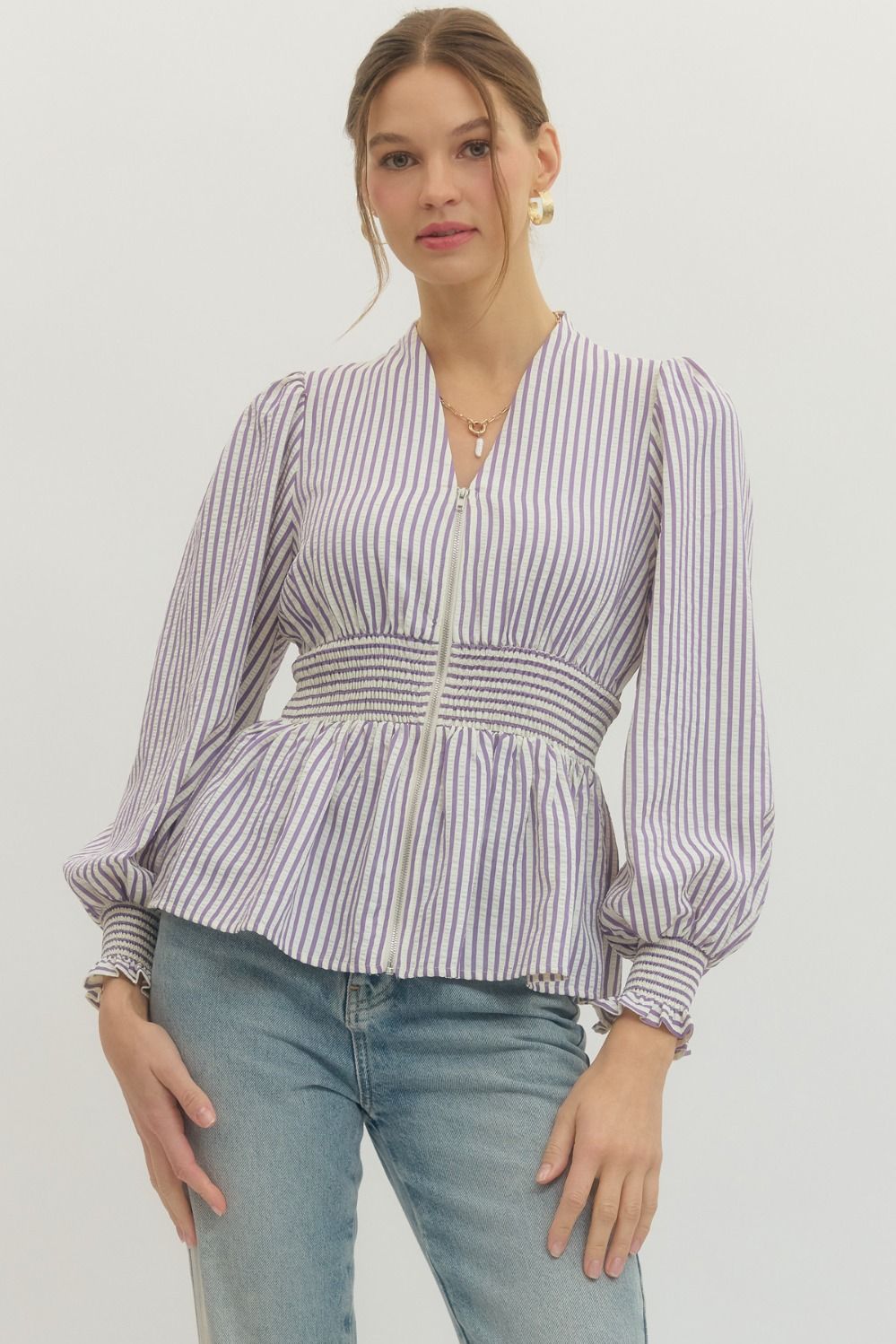 Stripe print long sleeve peplum top featuring smocked waistband and V-neck. Zipper closure at front. Smocked cuffs with ruffle trim. Unlined. Woven. Non-sheer. Lightweight.
