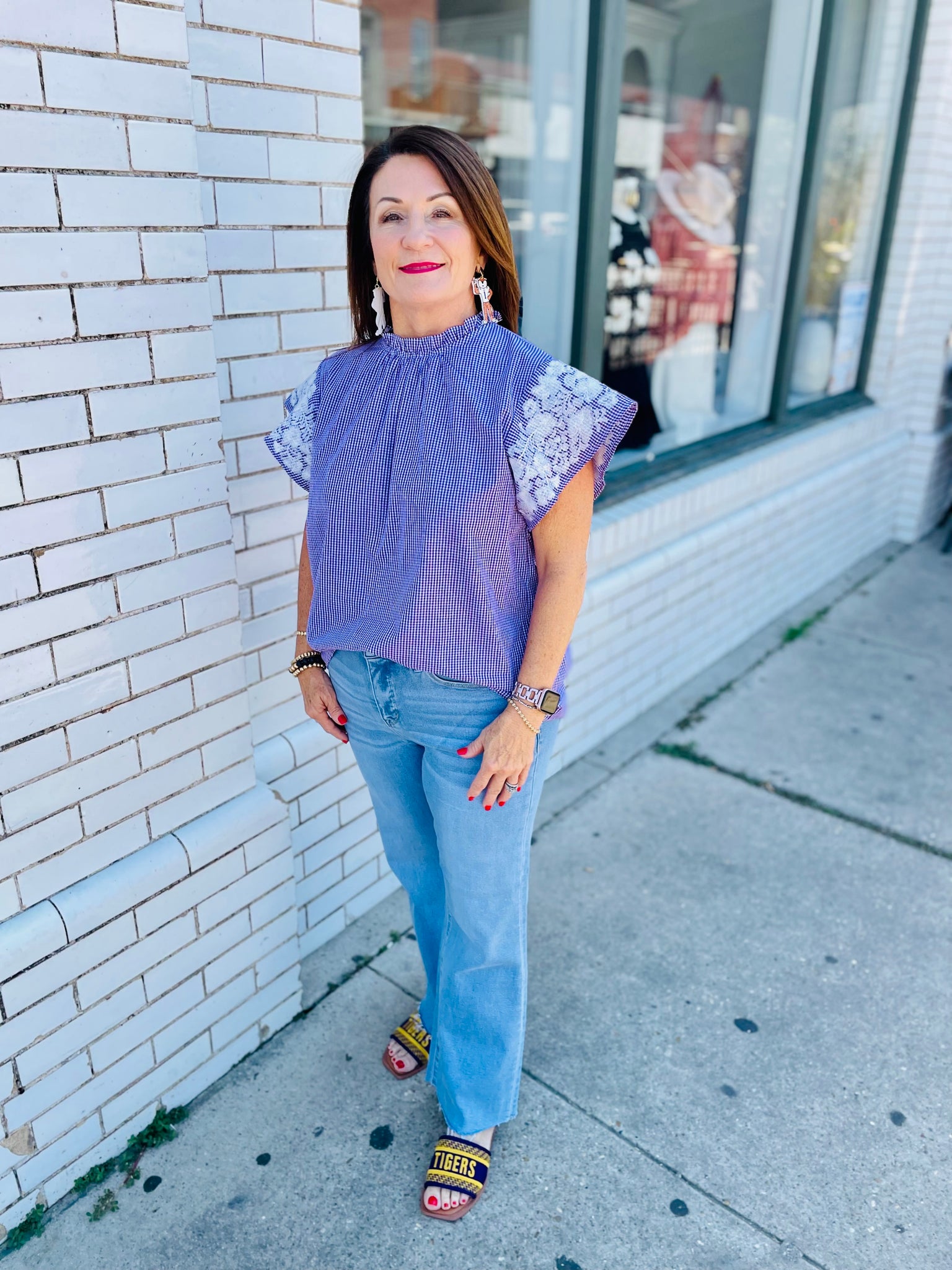 Gingham makes every top cuter! The Ruth Top in purple gingham with white embroidered sleeves is adorable dressed up or down! Or pair with denim shorts for your next Game Day outfit!