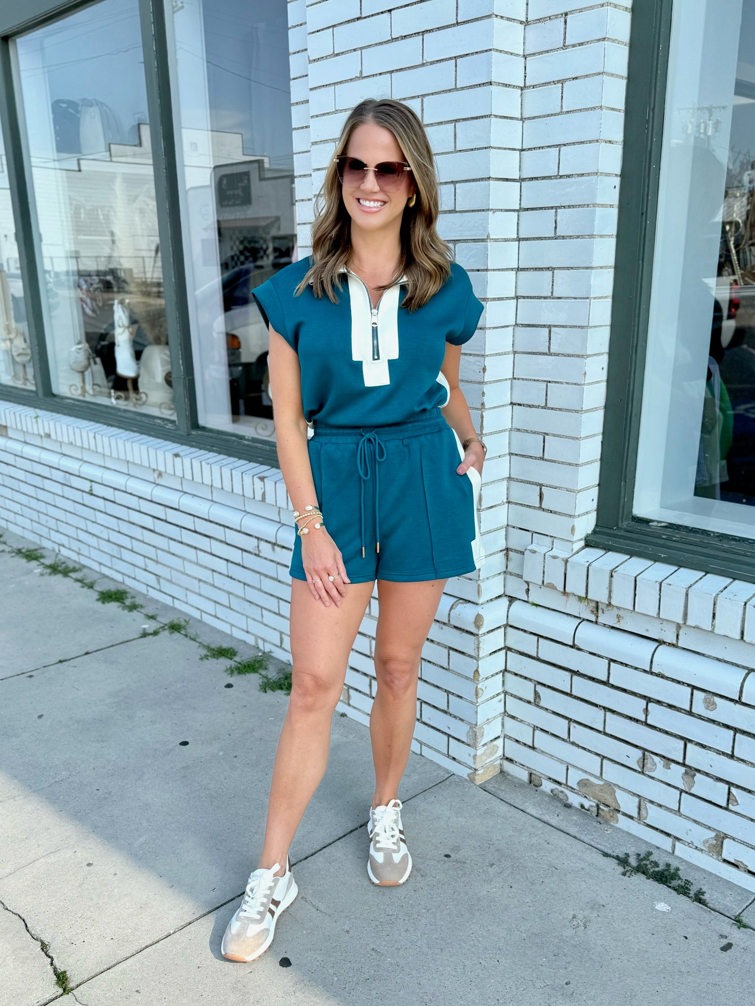 Top: Solid contrast accent zip-front pullover top featuring contrast side slit band.