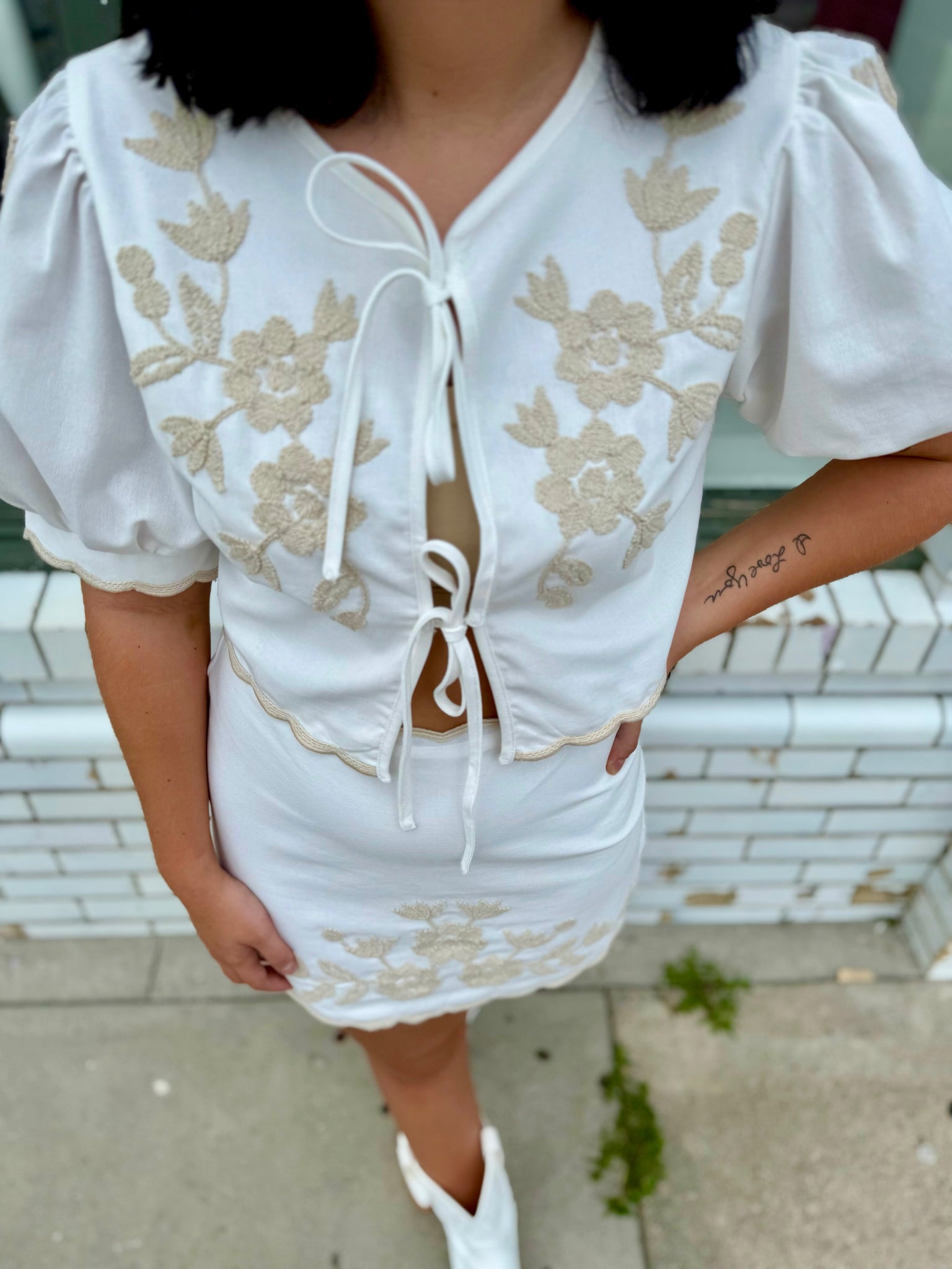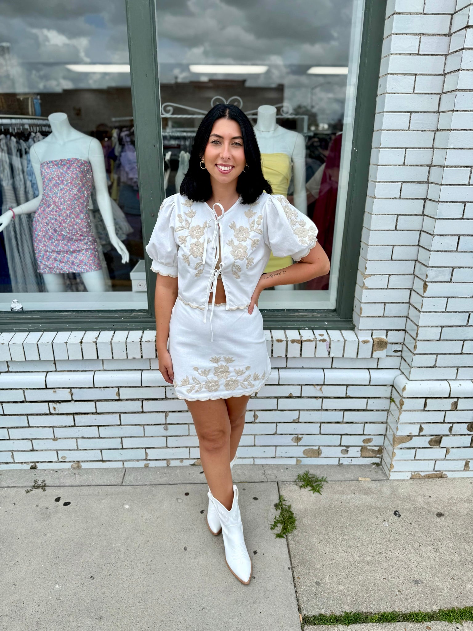 Top has slight puff sleeves and front ties. Skirt is lined with hidden side zipper.