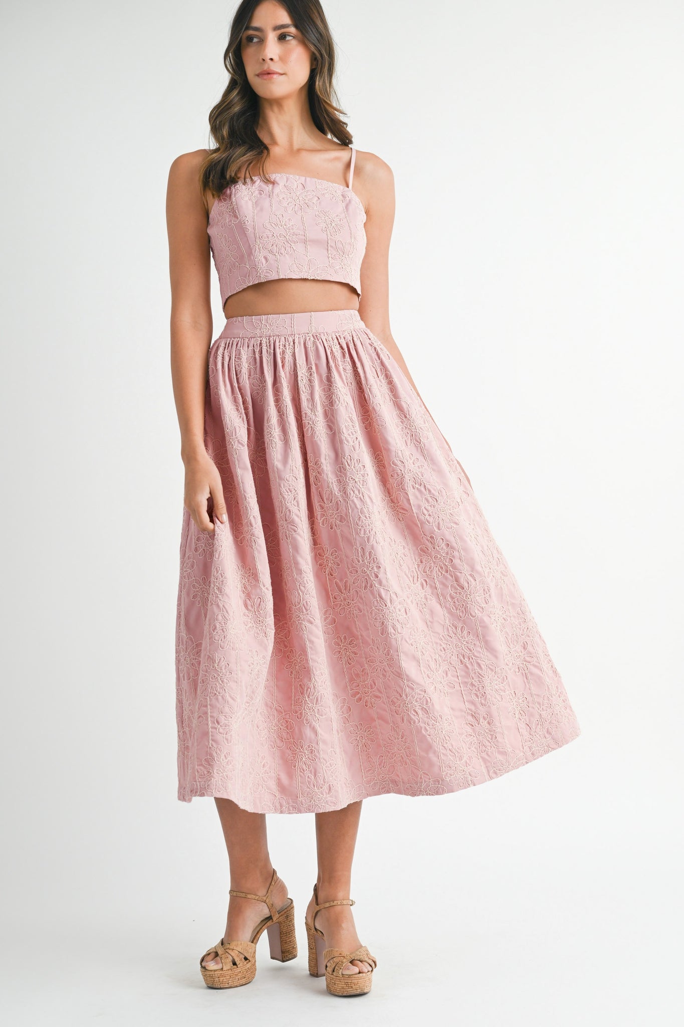 Floral embroidered adjustable spaghetti strap crop top and matching fit and flare midi skirt with side pocket set. Top has lining.