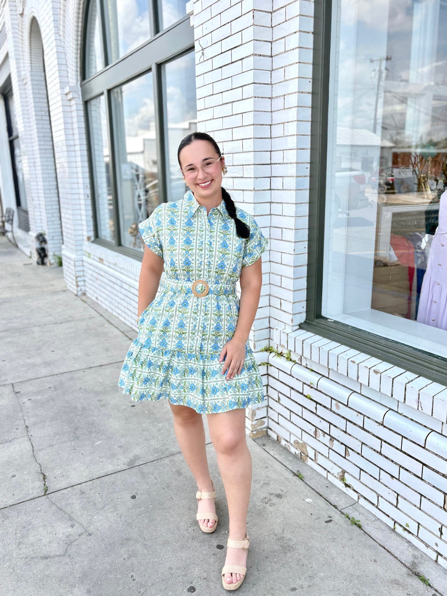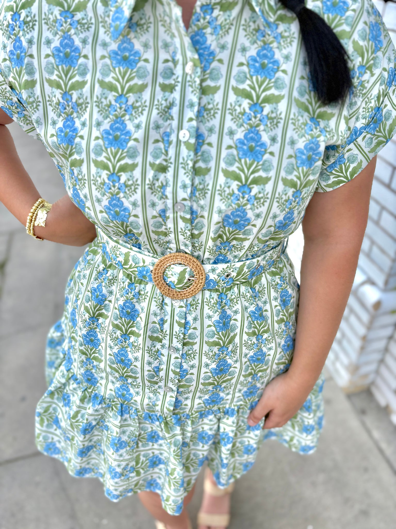 Botanical stripe print flutter sleeve mini dress featuring ruffle hem. Button closure at front. Detachable belt with woven buckle. Side pockets. Lined. Woven. Non-sheer. Lightweight.