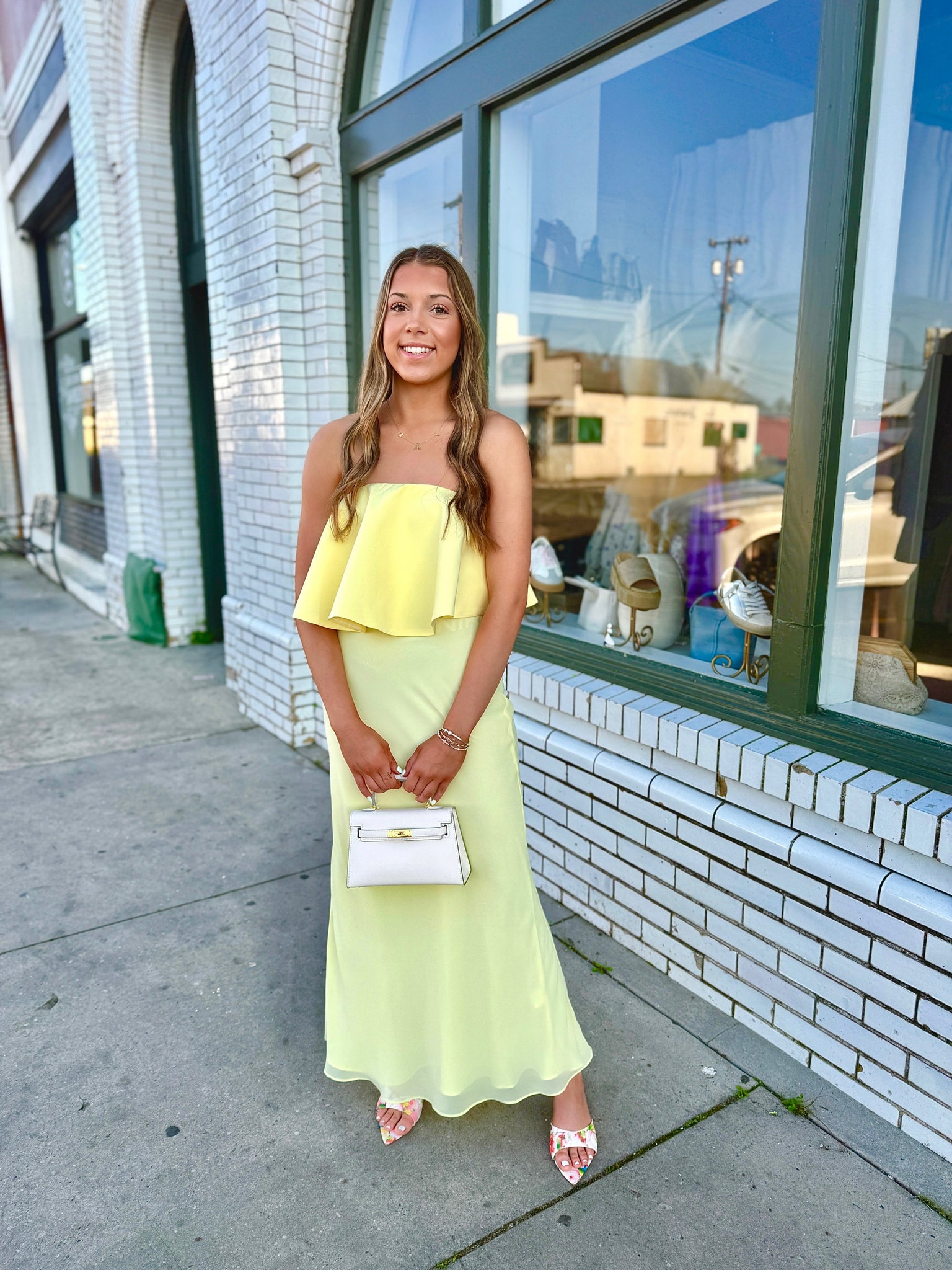 strapless design in a vibrant yellow hue. It features a fitted bodice with layered ruffle detailing at the top, adding texture and volume. The skirt flows smoothly from the waist, creating an elegant and streamlined silhouette.